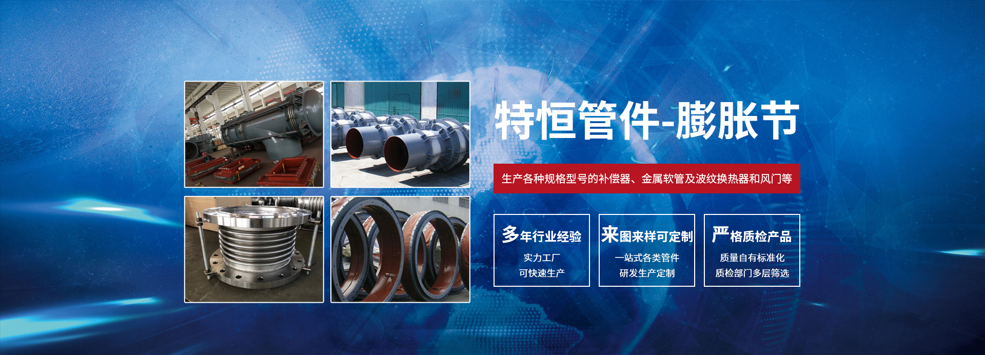 泰州市特恒管件有限公司坐落于風景如畫的江蘇省泰州市,是專業從事設計、生產金屬、非金屬膨脹節、橡膠補償器、不銹鋼金屬軟管、風門等的廠家。公司擁有各種先進生產、加工、檢測設備和強大的技術力量支持。我公司根據國內先進的加工成型工藝、科學的管理體制、先進的工裝設備不斷充實、完善質量保證體系,從而創造出高品質的產品。聚科技精英、出優質精品、品質卓越、信譽至上是我們的不懈追求。我公司愿以可靠的質量和良好的信譽,“誠信、公正、求實、創新”的經營理念與廣大用戶攜手合作,共創美好未來。我公司采用先進的標準進行設計、生產各種規格型號的補償器、金屬軟管及波紋換熱器和風門等。廣泛應用于電子、電力、核電、石化、冶金、儀表、儀器、航天、航 空、船舶、碼頭、建筑、食品、供熱等行業,曾先后為多家大型企業提供各種型號的優質補償器,產品遠銷國內外。我公司擁有一批專業技術人員和優秀的售后服務人員,以確保客戶在選型號以及客戶在產品安裝、運行中出現問題時可以得到及時、專業、有效的處理,并為客戶在設計、安裝、運行中提供專業的技術指導。